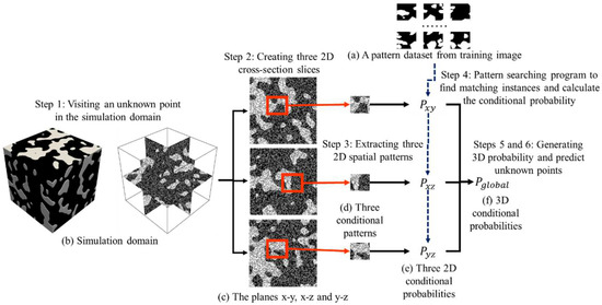 One main advantage of MPS is to reconstruct high-dimensional models from limited 2D training images [27]. In this work, we apply the probability aggregation framework. The core idea is to calculate the high-dimensional conditional probability according from multiple 2D cross-sections. Figure 9 displays an illustration of the probability aggregation method. Prior to the 3D modeling step, the pattern dataset is constructed according to the training image. There are six basic steps to realize high-dimensional modeling. (1) The program visits an unknown point in the 3D simulation domain. (2) According to the coordinate of an unknown point, three 2D planes are extracted across multiple cross-sections. In this case, planes x-y, x-z and y-z are independently sampled. (3) For each 2D plane, the program creates a conditioning pattern according to a user-defined template. We adopt a square template in order to simplify the conceptual example. The neighboring known points are used to constitute a conditioning pattern. Therefore, the computer individually creates three 2D conditioning patterns. (4) The pattern searching program is motivated to find similar instances which are presented in the training image. On the basis of the searching result, the center points of suitable training patterns are used to calculate the conditional probability. Since there are three query instances, three conditional probabilities are separately computed according to the 2D conditioning patterns and 2D training image. (5) The probability aggregation method focuses on combining three conditional probabilities. In this work, the Bordley formula is employed. Originating from Bayesian probability theory and the log-linear pooling framework, the Bordley formula addresses the challenges of reconciling conflicts and complementary probabilistic evidence. To preserve the statistical consistency, the odds ratio of each conditional probability is calculated. The Bordley formula performs a sequence of multiplications on odds ratio. Aiming at ensuring reproducibility, Algorithm 1 provides the pseudo-code to implement the Bordley formula. Moreover, the parameter specification plays an important role in the modeling quality. According to the experiment in reference [28], we specify the value of the weight as 0.8. The technical details of the Bordley formula are discussed in reference [28]. (6) Based on the fused probabilities, the program launches a random sampling procedure and predicts the value of unknown points. The preceding steps from (1) to (6) are constantly conducted until each point in the simulation grid has its value.