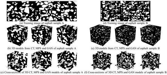 Based on the SAM segmentation and MPS reconstruction, we create 20 three-dimensional models from a two-dimensional training image. The size of the 3D model is specified as 128 × 128 × 128. The modeling result is shown in Figure 10. The white area presents the aggregate grain, while the black area expresses the asphalt binder. Moreover, we utilize a CT device to scan the asphalt mixture sample. As a non-destructive method, the CT image has the ability to explicitly express the internal structures. Based on an image thresholding program, the aggregate grains are identified by the distribution of pixel intensities. The 3D CT model shown in Figure 10d becomes the benchmark to examine our imaging, segmentation and modeling method. In addition, we use a Generative Adversarial Network (GAN) as the benchmark method. Based on ref. [29], a generator module associated with six transposed convolutional layers is implemented to create asphalt models. By comparison, the discriminator network is composed of six convolutional layers and max-pooling layers. Due to the absence of a 3D training image, the generator consistently creates 2D images which have matching structures with the 2D training image. To enrich the training dataset, we use MPS to produce 800 2D asphalt images. Then, the GAN network attempts to create a high-dimensional model by using a stack of 2D realizations. To yield realistic results, we specify the training epoch as 200. The GAN result is shown in Figure 10e. Based on visual inspection, there is no substantial difference between the CT model and MPS realizations. In this study, we use a desktop computer with the Windows 10 operating system. The computer used in this study was manufactured by Lenovo Group Limited, Beijing, China, The CPU and GPU configurations are Intel I9-11900 with 2.5 GHz and NVIDIA RTX 3060 with 12G memory. In this asphalt reconstruction case, the NNSIM program costs 0.97 CPU hours to create an individual 3D model. Therefore, the total reconstruction time is 19.4 h. Within the GAN framework, our program consumes 1.87 h to expand the training set. Based on GPU acceleration, the training programs of GAN take 45.4 h to obtain a converged neural network. Then, 0.03 h is used to generate 20 models.