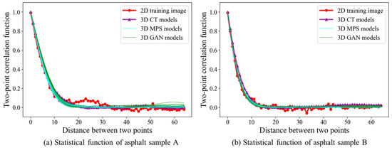 The key to modeling accuracy lies in replicating the geometric and topological characteristics of the training images. Therefore, the consistency between 2D training images and 3D asphalt mixture realizations attracts our attention. In this work, we employ two-point statistics to check the statistical characteristics of the numerical models. As a widely used method, the statistical functions provide a robust framework for evaluating the reconstructed models, preserving spatial continuity, connectivity and structural patterns.