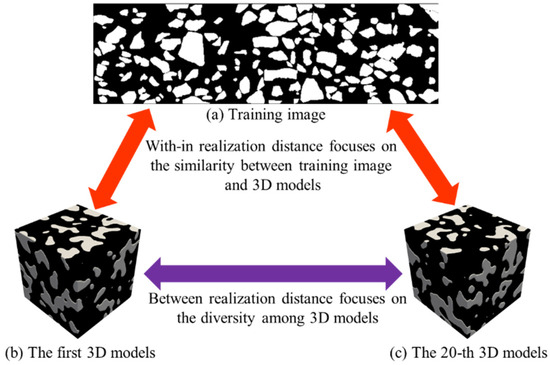 In the context of stochastic modeling, there are two main factors to evaluate the reconstruction accuracy. On the one hand, the computer program repeatedly extracts spatial patterns from the training image and reproduces suitable structures in the simulation domain. Therefore, the generated realization should have a strong similarity to the training image. On the other hand, diversity and variability are important to reflect the inherent uncertainty during the material production step. There is an intensive difference between two 3D realizations. Thus, the previous conflicting metrics brings a big challenge to the modeling and reconstruction program.