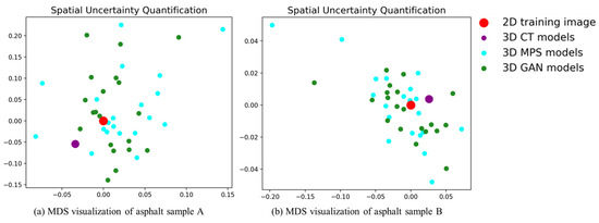 Based on the MPS realizations, we conduct ANODI to quantify the pattern reproduction and spatial uncertainty. For the first asphalt sample, the within-realization distance is 0.14. The value of the between-realization distance is 0.30. By comparison, the two distances of the GAN models are 0.13 and 0.27, respectively. On the other hand, the distances of the MPS models for the second asphalt sample reach 0.06 and 0.11. In contrast, the GAN program obtains 0.05 and 0.09 when ANODI calculates the within-realization and between-realization distances. A notable phenomenon is that the value of the Jensen–Shannon divergence is bounded by one for two probability distributions. Therefore, the calculation result indicates that MPS has comparable reconstruction quality to GAN. Furthermore, the visualization of ANODI is shown in Figure 13. Multi-dimensional scaling (MDS) is performed to realize the manifold learning step. In this 2D plot, one point expresses a 2D image or 3D model. Red, purple and blue are used to indicate the distribution of the 2D asphalt mixture image, 3D CT model and MPS realizations, respectively. Obviously, the red and purple points are surrounded by the blue points. This cloud dispersal implies that the spatial structures of the asphalt mixture sample are reconstructed by the MPS programs. Therefore, our method exhibits competitive performance in creating an ensemble of high-quality 3D models.