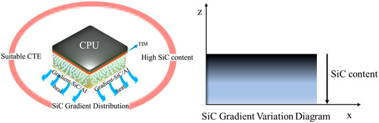 The relentless advancement in microelectronic technology has driven an exponential increase in power density and integration levels of modern devices, exemplified by 3D ICs and AI accelerators exceeding 500 W/cm2 thermal loads [1,2,3]. This escalation intensifies thermomechanical challenges, where interfacial stress concentrations and warping deformation in packaging materials account for over 50% of field failures in high-power electronics [4]. Conventional homogeneous heat sink materials (e.g., Cu and Al) face inherent limitations due to mismatched thermal expansion coefficients (CTE) with semiconductor substrates (Si: 2.5 ppm/°C vs. Cu: 16.7 ppm/°C), generating tensile stresses exceeding 200 MPa under thermal cycling [5,6]. Such stresses induce delamination, cracking, and warping deflection in Cu-based modules, severely compromising device reliability in applications like electric vehicle inverters and data center GPUs. High-SiC-content SiC/Al composite materials offer advantages such as high thermal conductivity, low coefficient of thermal expansion, high specific strength, high specific stiffness, wear resistance, and low density, making them highly promising for applications in power electronics, aerospace, and military sectors.