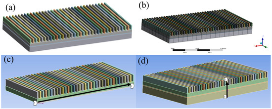 The thermomechanical behavior of the packaging system was analyzed using ANSYS 2021 R2 employing a sequentially coupled approach to integrate steady-state thermal analysis with static structural mechanics. Hexahedral-dominated meshes (Figure 2b) were generated with local refinement (0.2 mm at critical interfaces) to resolve thermal gradients. Transient thermal analysis was performed with a Newton–Raphson nonlinear solver, incorporating temperature-dependent material properties for gradient layers (Figure 1) through user-defined field functions. The chip power profile followed a trapezoidal waveform (50–300 W, 5 s ramp/plateau), while convective cooling (h = 1200 W/m2·K) was applied to fin surfaces using SURF152 elements. The 5 s ramp-up to 300W thermal load condition simulates the real transient scenarios of high-power electronic devices, such as the IGBT switching surge in electric vehicle inverters. Structural analysis utilized the full Newton–Raphson method with large deformation effects activated, resolving contact nonlinearities at interfaces via augmented Lagrange formulation (penalty factor: 0.1; friction coefficient: 0.25). This paper investigates the stress and strain in the axial and radial directions using simulation models, as shown in Figure 2c,d.