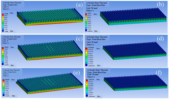 Temperature distributions and total heat flux distributions of different heat sink materials: (a,b) Cu; (c,d) Al; (e,f) SiC/Al.