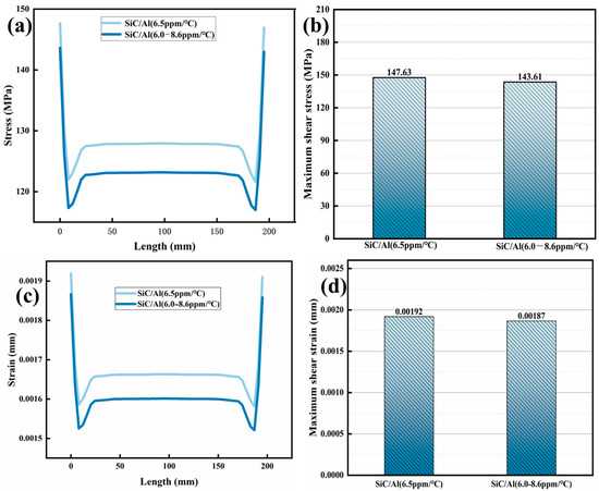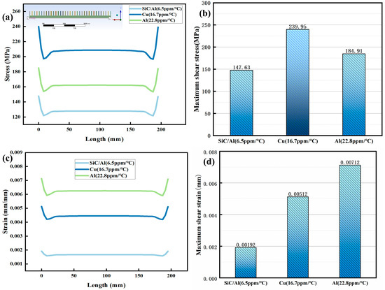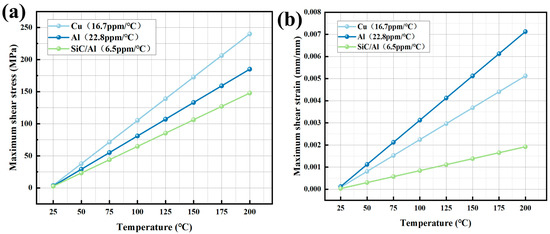 wherein E represents the elastic modulus (Cu: 126 GPa), α is the CTE (Coefficient of Thermal Expansion), and ΔT is the temperature difference. While Al shows lower peak stress (184.91 MPa), its high plasticity induces excessive strain (0.00712 mm), causing permanent deformation (Figure 5c). The mechanism is consistent with that of “plastic strain accumulation leading to fatigue failure in Al” as described in reference [15]. The SiC/Al composite outperforms both, limiting stress to 147.63 MPa and strain to 0.00192 mm—a 38.4% stress reduction compared to Cu—attributed to its CTE (6.5 ppm/°C) being 2.6 ppm/°C closer to silicon.