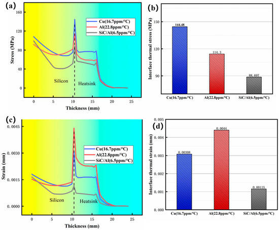 Figure 6 depicts the distribution of radial stress-strain in different homogeneous materials (Cu, Al, and SiC/Al composite). A sharp stress concentration is observed at the chip-heatsink interface across all materials. Notably, the Cu heatsink exhibits the highest peak radial stress (144.48 MPa), followed by Al (114.3 MPa) and the SiC/Al composite (88 MPa). Correspondingly, Figure 6c,d illustrates that the SiC/Al composite demonstrates a significantly reduced interfacial strain (0.00115 mm) compared to Cu and Al. These results underscore the critical importance of minimizing interfacial stress concentrations, which arise from CTE mismatch, to mitigate detrimental mechanical strain in microelectronic packaging.
