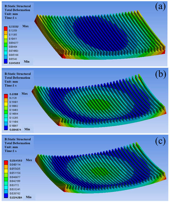 Contour plots of warping deformation distribution for different packaging materials: (a) Cu; (b) Al; (c) SiC/Al (unit: mm).