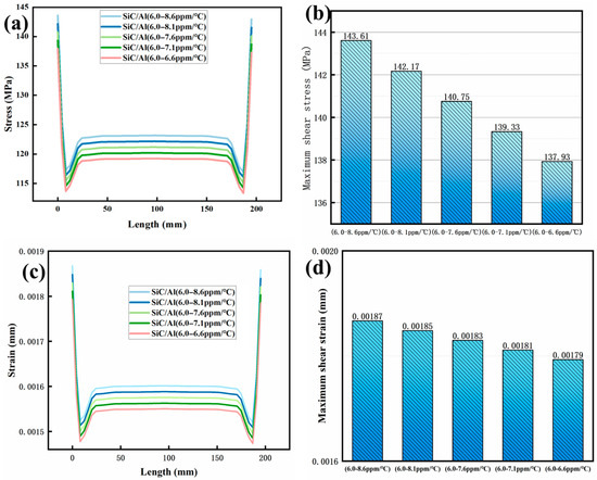 The strategic engineering of thermal expansion coefficient gradients is central to optimizing the thermomechanical performance of the SiC/Al composites. As demonstrated in Figure 10, parametric analysis of the CTE gradients (6.5–9.0 ppm/°C) reveals critical relationships between gradient design and material behavior under thermal cycling. When transitioning from a uniform CTE profile (6.5 ppm/°C, Figure 10a) to a progressive gradient (6.5–9.0 ppm/°C, Figure 10f), the maximum warping deformation decreases by 52% (0.133 mm → 0.065 mm), while the peak interfacial shear stress is reduced by 28% (144.48 MPa → 88 MPa). This enhancement is attributed to the adaptive thermal expansion matching mechanism, which eliminates abrupt strain discontinuities and redistributes thermal stress across gradient layers.