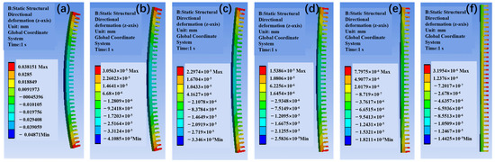 Optimization of thermal expansion coefficient for warping of gradient SiC/Al material (without fixed constraints) (ppm/°C): (a) 6.5–6.5; (b) 6.5–7.0; (c) 6.5–7.5; (d) 6.5–8.0; (e) 6.5–8.5; (f) 6.5–9.0.