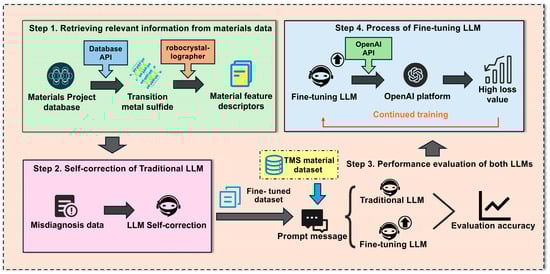 Our research methodology follows a structured workflow for developing and evaluating a domain-specific Large Language Model (LLM) optimized for transition metal sulfide analysis, as illustrated in Figure 1. This comprehensive framework consists of four interconnected steps: In Step 1, data acquisition begins with extracting transition metal sulfide data from the Materials Project database API using specific chemical criteria. The robocrystallographer [28] then converts crystallographic structures into standardized textual descriptions, generating material feature descriptors that capture atomic arrangements, bond properties, and electronic characteristics in natural language format. Step 2 implements a self-correction process for traditional LLMs by identifying and addressing misdiagnosis data through verification protocols that cross-validate property predictions against established computational principles. This ensures training data reliability, which is crucial for specialized scientific domains. Step 3 conducts performance evaluation of both traditional and fine-tuned LLM variants using standardized prompt templates and metrics (, RMSE, F1 score) to quantify differences between general-purpose and domain-specialized models. Step 4 employs iterative fine-tuning on the OpenAl with API version dated 30 May 2024 using supervised learning with structured JSONL format training examples. The process includes progressive multi-iteration training through loss tracking and targeted improvement of high-loss data points. Each iteration aims to minimize loss values while preserving generalization capabilities. This systematic approach enabled the development of a specialized model for predicting catalytic properties of transition metal sulfides with high accuracy, overcoming the limitations of traditional methods in this complex materials domain.