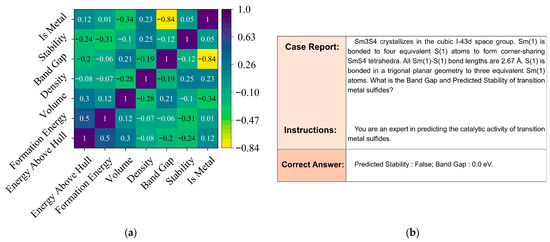 (a) Statistical Evaluation of Feature Correlations in Transition Metal Sulfide Datasets for traditional ML; (b) Case Analysis of Transition Metal Sulfide Property Prediction Using Fine-tuned Models.