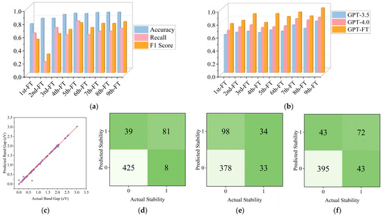 (a) Performance metrics for Predicted Stability; (b) Comparison of Band Gap prediction accuracy across different models; (c) Use a fine-tuned model to predict the prediction accuracy of the Band Gap (purple circles represent individual data points, where each point corresponds to a material with a known actual band gap and the model’s prediction of that band gap, while red line is the ideal prediction line, which represents perfect prediction accuracy); (d) Represent the prediction accuracy of Fine-tuned model for Predicted Stability; (e) Represent the prediction accuracy of GPT-3.5 for Predicted Stability; (f) Represent the prediction accuracy of GPT-4.0 for Predicted Stability.