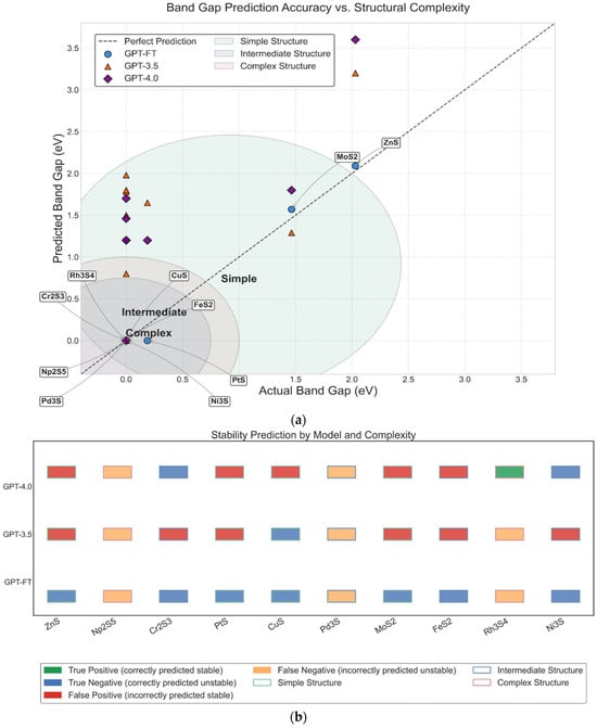 (a) Band gap prediction accuracy of GPT-FT, GPT-3.5, and GPT-4.0 across materials of varying structural complexity; (b) Predicted stability classification performance of GPT-based models on structurally diverse compounds.
