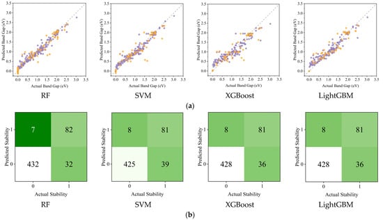 (a) Experiment and predict band gap values on training and test sets by four major traditional ML algorithms (the purple points represent the training set data, while the orange points represent the test set data); (b) Prediction accuracy of traditional ML algorithms for Predicted Stability.