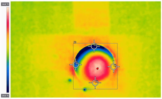 Thermal imaging measurements were taken in various areas of the tested material. The first measurement was performed on the external surface of the briquette, recording the maximum and minimum temperatures. An example thermogram is shown in Figure 2.