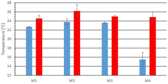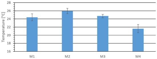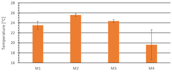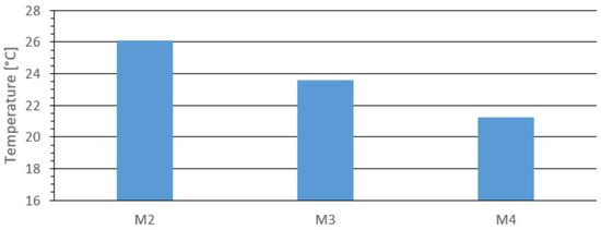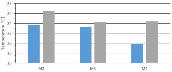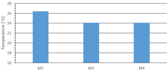 Comparing the obtained results, it was found that for material M2, no significant difference was observed (the difference was 0.1 °C, within the measurement error). For material M3, the average internal temperature was 1.3 °C higher than the maximum surface temperature. For material M4, the difference was 2.1 °C.