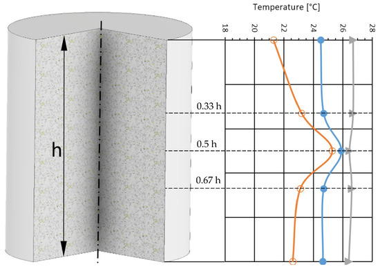 Comparing the results in Figure 3, Figure 4 and Figure 5, it can be seen that for materials M1–M3, the highest temperature on the external surface was at the center of the top surface and the lowest at the edges. In contrast, for material M4, the highest surface temperature was not at the center. The most significant difference in surface temperature between the center and edges was 2.1 °C for material M4, and the smallest was 0.6 °C for M3. The total difference between the highest and lowest temperatures on the external surface was 9.3 °C for M4, 2.4 °C for M2, 1.9 °C for M1, and 1.4 °C for M3.