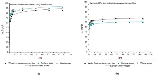 Non-linear regressions of kinetics data (initial concentration of 4-MBC: 100 µg/L, mMPs fibers: 50 mg, n = 3, mean value ± SD), obtained using Elovich model for 4-MBC on (a) MPF A and (b) MPF B.