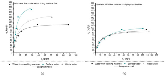 Adsorption isotherms plots (Initial concentrations of 4-MBC: 25, 50, 70, 100, 150, and 200 μg/L, mMPs fibers: 50 mg, n = 3, mean value ± SD) for 4-MBC on (a) MPF A and (b) MPF B.