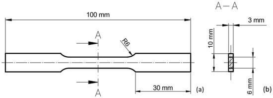 Geometry and dimensions of test specimens intended for static tensile testing. (a) Sample contour; (b) cross-section of measured area [].