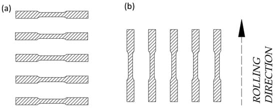 Orientation of specimens in relation to the rolling direction of the sheet metal. (a) Perpendicular to the rolling direction; (b) parallel to the rolling direction.