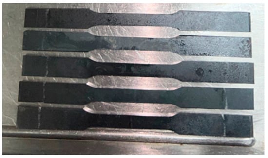To ensure repeatability of the results, five specimens were prepared for each tested configuration. Prior to cutting, the sheet was carefully measured and cutting lines were marked to eliminate dimensional inaccuracies. The specimens were cut from the sheet metal using a guillotine and a band saw. The final contour was shaped using a CNC milling machine, ensuring high dimensional precision and consistency of specimen geometry. During all machining operations, a coolant–lubricant spray was applied to minimize tool wear and reduce the thermal impact of cutting on the material’s structure and mechanical properties. In addition, the temperature of the machined material was monitored immediately after processing to ensure that it did not exceed levels that could alter its mechanical characteristics. Figure 3 shows the first batch of specimens prepared for static tensile testing. To facilitate identification during mechanical testing and data analysis, specimens were labeled accordingly. Samples cut perpendicular to the rolling direction were marked as SX1, SX2, SX3, SX4, and SX5. Samples cut parallel to the rolling direction were labeled as SY1, SY2, SY3, SY4, and SY5.