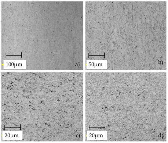 Images of the S700MC steel microstructure after hot rolling taken at different magnifications: (a) ×20, (b) ×50, and (c,d) ×100.