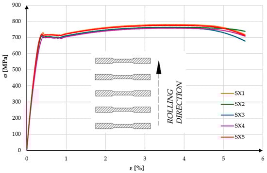 Stress–strain curves of the “SX” specimens obtained during a static tensile test.