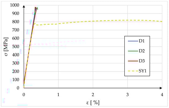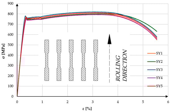Stress–strain curves of the “SY” specimens obtained during a static tensile test.