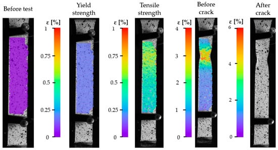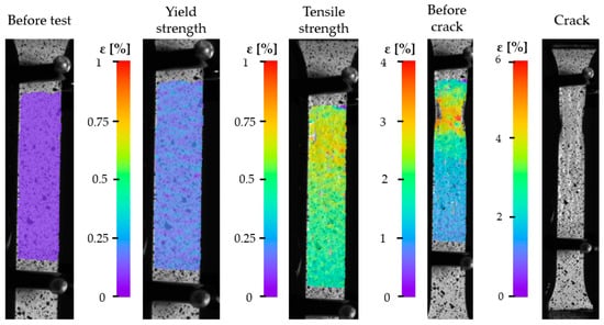 To analyze material displacements under plane strain conditions during bending tests, the DIC method was employed. Figure 9 presents the measurement results for specimen SY4. The figure includes images of the specimen in five different states. The first image on the left shows the specimen prior to the static tensile test and is treated as the reference image for displacement analysis in subsequent deformation stages. To the right of the four deformation images, color scales are provided, representing the values of effective engineering strains. The DIC system introduces its own sources of uncertainty, including optical resolution limits, lighting conditions, lens distortion, and correlation errors. In this study, the DIC setup used a high-resolution camera and a validated calibration grid, achieving a displacement resolution on the order of ~0.01 mm and a strain resolution of approximately ±0.01%. Given that observed strains reach values above 3%, these uncertainties are negligible and allow for confident assessment of strain localization phenomena, such as necking. Based on the images—particularly those corresponding to the tensile strength and before crack states—a noticeable discrepancy between the stress–strain curve and the DIC measurement is observed. The stress–strain curve suggests a decrease in stress after reaching the tensile strength point. However, DIC analysis, consistent with the theory of engineering stresses, shows that after reaching the ultimate tensile strength, necking occurs and localized strain increases, which in turn causes the actual (true) stress in the material to continue rising. This divergence illustrates the limitations of conventional stress–strain representation and highlights the utility of DIC in providing spatially resolved strain data, particularly in post-yield and necking regions where standard extensometers cannot operate. The uncertainty of local strain data from DIC remains low enough to capture these nonlinearities effectively. Figure 10 presents the images recorded during the tensile test of specimen SX4. The individual images are similar in nature to those captured for specimen SY4. In the image corresponding to the stress level at the upper yield point, uniform deformation is observed across the surface of the specimen (indicated by a consistent color distribution). Compared to the reference image, a clear color shift is visible across the entire surface, indicating widespread strain. This uniform strain pattern suggests that the material responded predictably within the elastic and early plastic deformation ranges. The image captured at the point of maximum tensile stress shows the initiation of failure propagation—visible as orange/red regions, which correspond to the highest local stresses. These stress concentrations appear at the center of the specimen, consistent with theoretical expectations for necking in ductile metals. In the subsequent image, taken just before fracture, a well-defined necking zone is clearly visible, representing the region of maximum localized deformation. The onset of necking coincides with a plateau in the stress–strain curve, confirming the transition to unstable plastic flow. This zone corresponds to the actual true tensile strength of the material just before rupture, and the DIC analysis allows quantification of local strain fields with sub-millimeter precision. The uncertainty associated with this analysis is mainly linked to speckle pattern quality and image noise, both of which were minimized using appropriate surface preparation and calibration.