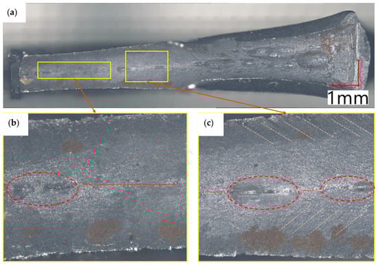 Photograph of the fracture surface of the SX4 sample, illustrating the regions of crack propagation: (a) sample integrals view; (b,c) regions of crack propagation.