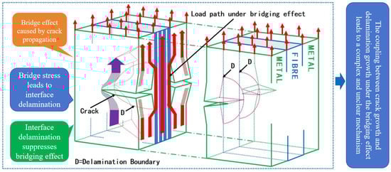 The excellent fatigue damage tolerance performance of FMLs is the result of fiber bridging [4,5]. As shown in Figure 1, two damage modes occurred in the fatigue process of the laminates: crack propagation in the metal layer and delamination propagation at the metal/fiber interface [6,7]. Fatigue crack propagation and interfacial delamination propagation interact and couple with each other under the bridging effect, which results in complex and unclear crack propagation mechanisms [8,9]. For aviation materials, overload loads are more commonly applied during service, which leads to damage interaction phenomena such as the overload hysteresis effect [10] and damage acceleration effect [11]. FMLs will be subjected to the interaction of the bridging effect and overload effect (hysteresis effect, acceleration effect) under overload load. The mechanisms of delamination propagation and crack propagation are more complex, which are difficult to explore. Therefore, it is difficult to build the model of crack propagation life reasonably.