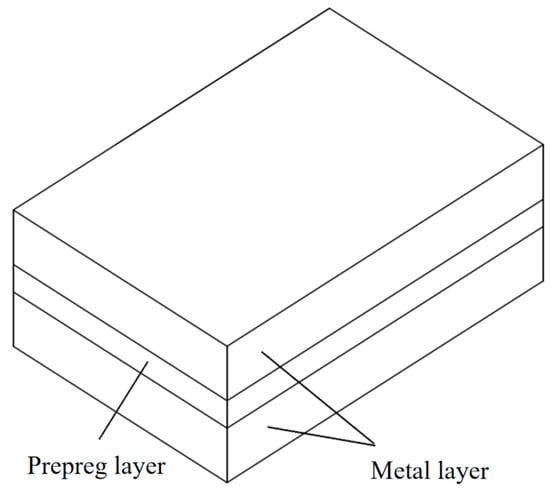 Fiber/Al-Li laminates with a 2/1 structure were used in the experiment. The laminate was composed of metal and fiber prepreg, where metal is two layers and fiber prepreg is one layer. The 2060-T8 Al-Li alloy was used as the metal layer, and the longitudinal direction of the material was used as the sampling direction of the Al-Li alloy plate. The SY-24/S4C9-1200 material was selected as the fiber prepreg layer, and the fiber direction of prepreg layer is 0°. The measured thickness of the 2060-T8 Al-Li alloy plate is 1.9 mm, and the chemical composition (mass fraction) of the 2060-T8 Al-Li alloy is shown in Table 1. The measured thickness of the fiber prepreg layer is 0.9 mm; S4 fiber and SY-24 adhesive are contained in the fiber prepreg layer. The fiber prepreg layer is prepared by the compression molding process; the properties of both materials are shown in Table 2. The performance test results of the Al-Li alloy and fiber prepreg layer are shown in Table 3, and the laminates with 2/1 structure are shown in Figure 2.
