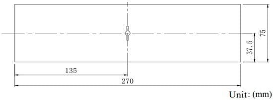 The M(T) tensile specimen with a center crack is used to the test the fatigue crack propagation for Fiber/Al-Li laminates. The specimen length is 270 mm, the specimen width is 75 mm, the diameter of the central round hole is 3 mm, and the saw-cut length is 2 = 10 mm. The specimen form with a center crack is shown in Figure 3, and the crack propagation test specimen of the laminates is shown in Figure 4.