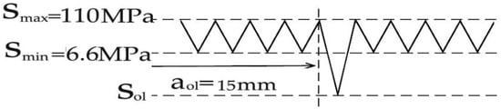 The test was conducted with reference to “Standard test method for fatigue crack propagation rates of metallic materials” (GB/T 6398-2017) [22]. The test is carried out at a room temperature and air environment under the loading with sine wave, and the test frequency is 10 Hz. Selection principles for loading frequency are as follows: sufficient loading response was ensured for the specimen, and the feedback loading of the specimen was consistent with the peak and valley values of the given loading. Constant loading at R = 0.06, single-peak tensile overload (Rol = 1.4, 1.8), and single-peak compression overload (Rol = −0.6, −1.8) were used for the loading mode in the test, where the overload position is aol = 15 mm. Taking the reference stress (110 MPa) and tensile overload ratio (1.8) as an example, the schematic diagram of tensile overload loading is shown in Figure 6. Taking the reference stress (110 MPa) and compression overload ratio (−1.8) as an example, the schematic diagram of compression overload loading is shown in Figure 7. When the crack grows to the specified crack length aol under constant loading, a corresponding loading Sol = Rol × Smax is applied according to the overload ratio Rol. After that, the constant amplitude crack propagation test is continued. The crack on the right side of the test specimen is taken as the observation object. The specific steps are as follows: (1) At the beginning of the experiment, an operation on a prefabricated crack is carried out, where the average length of the prefabricated crack is about 1.5–2 mm. During this period, two stresses greater than the test stress are applied in a gradually decreasing order. (2) After the prefabricated crack is completed, the applied stress is restored to the test stress. The testing machine is set to stop working every 5000 loading cycles. (3) Every time the machine stops, the crack length of the test specimen is read. The testing process is shown in Figure 8. Crack propagation data is read through the microscope behind the specimen in the figure.
