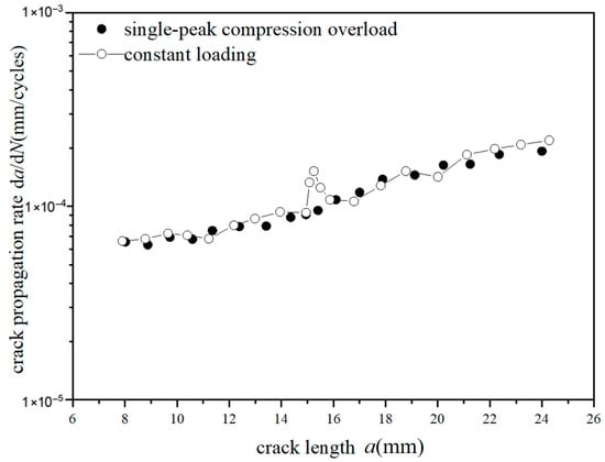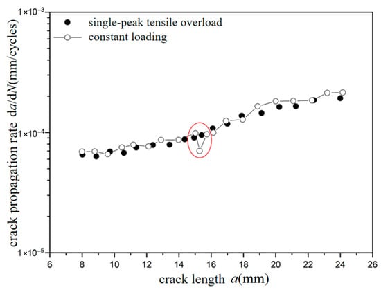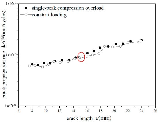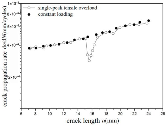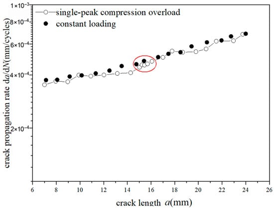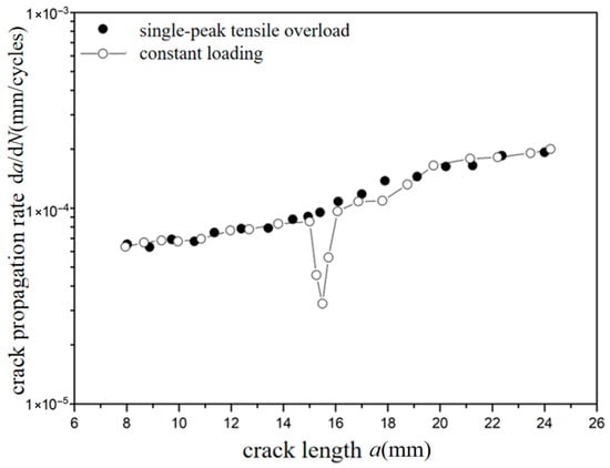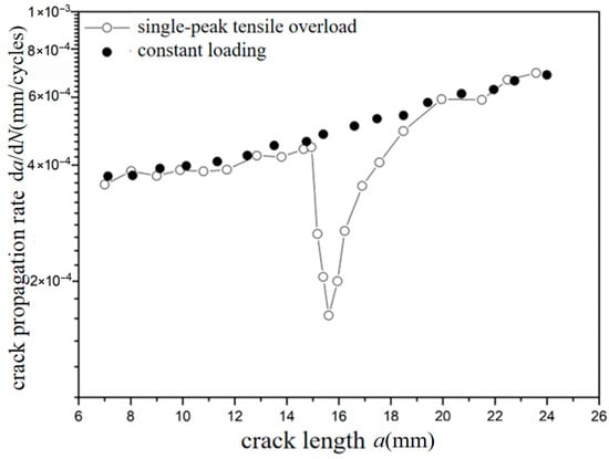 The crack propagation behavior characteristics at overload ratios of −0.6 and −1.8 under two different stresses of 70 MPa and 110 MPa were analyzed. It was found that there was no significant fluctuation for the crack propagation behavior at an overload ratio of −0.6. However, there was a significant fluctuation for the crack propagation behavior at overload ratio of −1.8, which means that crack propagation is accelerated. This phenomenon indicates the existence of a “certain value”. When the overload ratio is greater than this value, overload acceleration is generated. When the overload ratio is less than this value, the crack propagation behavior is not obviously changed. Similarly, when the crack extends to a certain length after overload, the crack propagation rate returns to that of the corresponding crack length under constant amplitude loading.