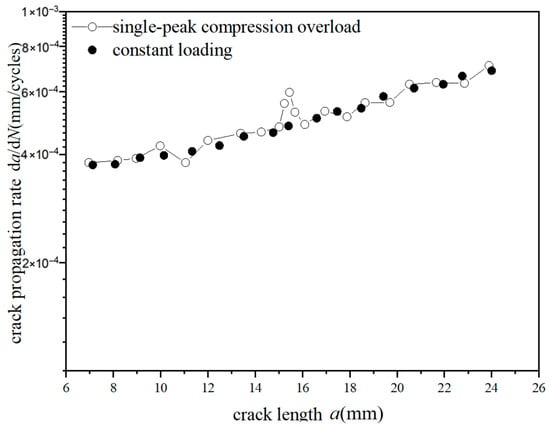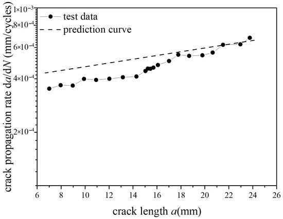 During the experiment, the fatigue crack length a corresponding to different loading cycle times N can be read through a microscope. Due to the fact that the experimental data fitted by the secant method can more accurately reflect the changing trend of the experimental results, the secant method was used to represent the crack propagation rate da/dN in this paper. The secant method can calculate the slope of a straight line connecting two adjacent experimental points through the a-N curve; the equation for the fatigue crack propagation rate is as follows: