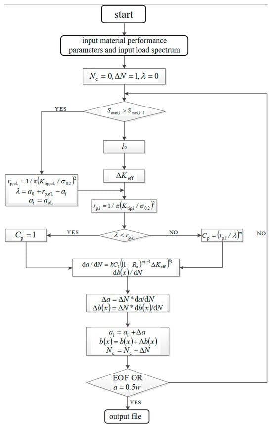 Fatigue crack propagation behavior under tensile overload is predicted based on an improved Wheeler model, and its implementation process is shown in Figure 18. When the model is subjected to a constant amplitude load, the crack propagation rate stabilizes, and an improved equivalent crack length model is used to predict its crack propagation rate. When the model recognizes a change in applied loading that is greater than the constant amplitude loading, a crack propagation model used in the overload hysteresis zone is adopted to predict the crack propagation rate in the hysteresis zone. When the crack extends to the edge of the hysteresis zone, the improved equivalent crack length model is used.