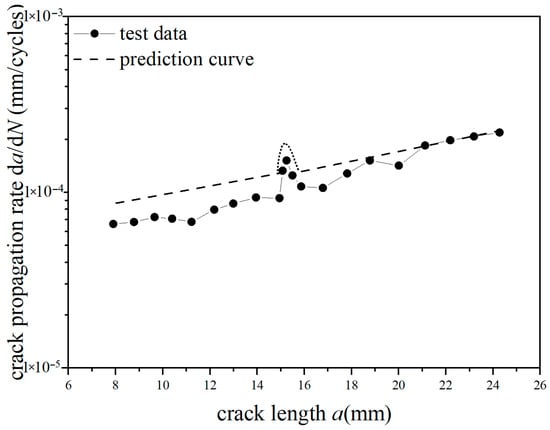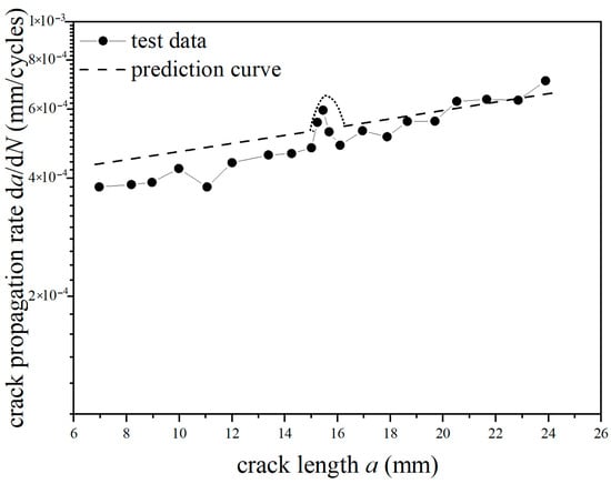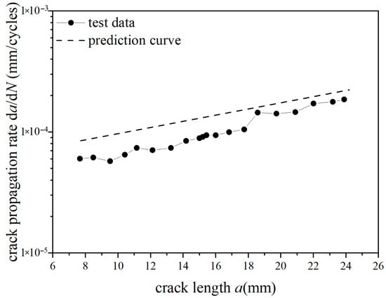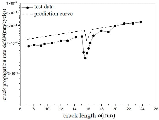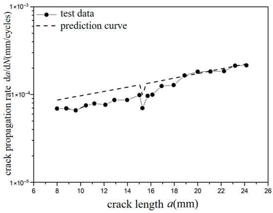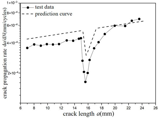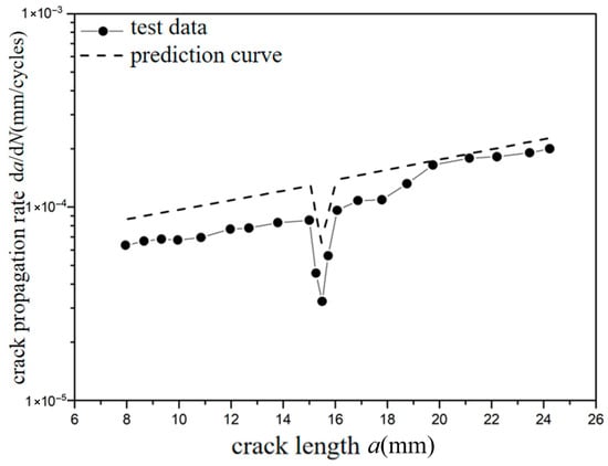 Prediction results of crack propagation rate (CA Smax = 110 MPa, CO Rol = −1.8).