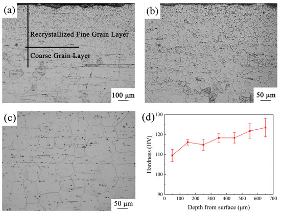 The optical micrographs of (a) the G450 sample, (b) the magnified view of the recrystallized fine grain layer, and (c) the HCG sample; (d) the Vickers hardness distribution along the depth direction of the G450 sample.