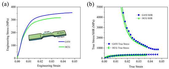 (a) Engineering stress–strain curves of the HCG and G450 samples and (b) the true stress–true strain and the strain hardening rate curves.