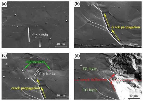 Figure 4b), a major crack initiated in the CG region and propagated longitudinally through the microstructure. The crack propagation path exhibited significant deflection as it penetrated into the FG region (