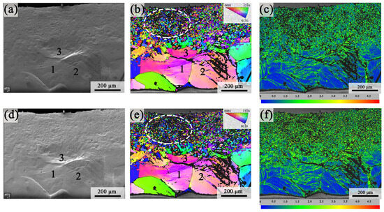 The SEM images, IPF maps, and KAM maps at strains of (a–c) 2.67% and (d–f) 3.02%. The numbers 1, 2, and 3 correspond to the different positions in the CG region.