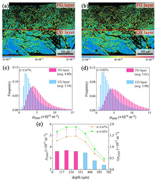 Figure 7e depicts the variation in GND density with depth (dotted lines) at different strains; meanwhile, the pink and blue histograms represent the GND density increments in the FG and CG layers, respectively. Notably, both the GND density and its increments were markedly higher in the FG region than in the CG region, indicating that the FG region played a more significant role in accommodating plastic strain during tensile deformation [