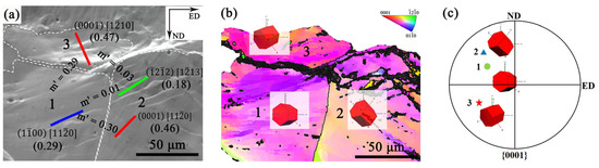 The m’ analysis of regions prone to crack initiation in the G450 specimen: (a) SEM image at strain of 3.02%, where the solid red, blue, and green lines represent slip traces; (b) the IPF map of grains 1, 2, and 3; and (c) the corresponding pole figure at strain of 3.02%.