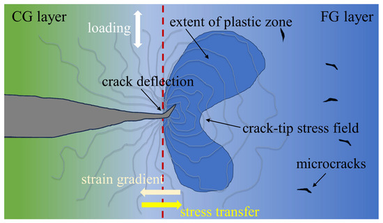 (3) The gradient structure exhibited significant fracture resistance through the following two complementary mechanisms: intrinsic toughening via adaptive plastic zone expansion that relieved crack tip stress concentrations, and extrinsic toughening through crack deflection and stress/strain partitioning between the hard and soft regions. The synergistic interaction of these two mechanisms significantly postponed crack advancement.