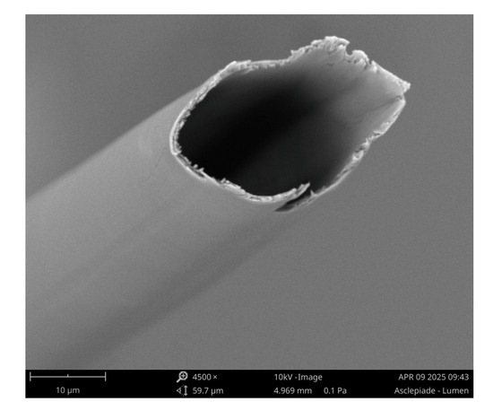In our previous study, nonwovens composed of milkweed, PET, and PLA fibers have been produced using the Spike air-laid process, with the goal of producing a thermal insulating material for winter jackets [21]. The thermal insulation fillings had a mass per unit area ranging from 55 to 170 g/m2 and a thickness that varied from 4.80 to 10.45 mm. The fiber contents have been modified to evaluate their impact on the functional properties of the nonwovens. The objective of the present work is to develop 25.4 mm thick nonwovens using the same process for building applications. The nonwovens consisted of milkweed, core/sheath fibers (PET core and a polyolefin sheath in a 50:50 ratio) (LM 2.2), and PLA fibers. Figure 1 displays the microstructure of a milkweed fiber obtained by a scanning electron microscope (SEM). A commercially available thermal insulation material made of 100% hemp was purchased from Sprinterfreak (Saint-Roch-de-l’Achigan, QC, Canada) for comparison purposes.