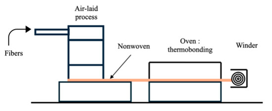 Nonwovens were manufactured using the air-laid Spike process and consolidated through thermal bonding at 150 °C. Figure 2 presents a schematic design illustrating the different steps of the process. More details regarding the fiber properties and the process are available in a previous study [17].