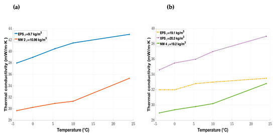Thermal conductivity depends on many parameters, such as the internal structure, density, porosity, moisture content, and temperature [45,46,47]. Indeed, an insulation material can behave differently depending on its environment, whether cold or warm [3]. Table 3 presents the variation of thermal conductivity with temperature for nonwovens and the reference.