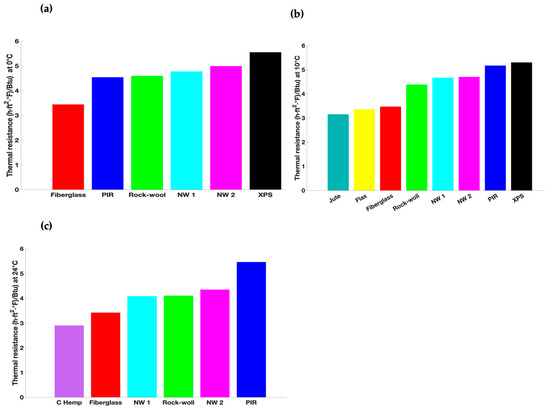 The thermal resistance of fiberglass, rock wool, polyisocyanurate (PIR), XPS, jute, flax, and commercial hemp (C hemp) was calculated based on the thermal conductivity reported in the following studies: Ref. [54] for fiberglass, rock wool, PIR, and XPS, Ref. [12] for jute and flax, and Ref. [55] for C hemp.